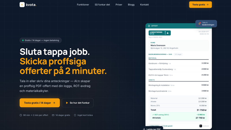 Från röstinspelning eller formulär till färdig PDF-offert på under en minut. Byggt och bevisat med Kvota.se.